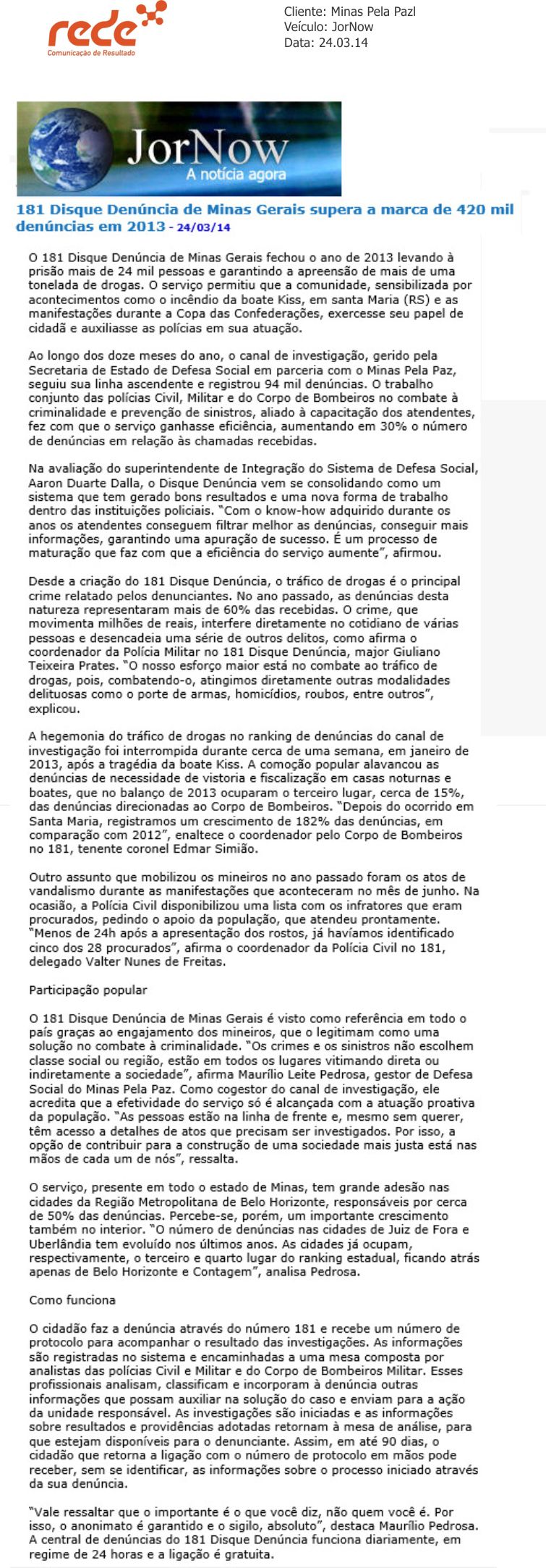181 Disque Denúncia de Minas Gerais supera a marca de 420 mil denúncias em 2013.