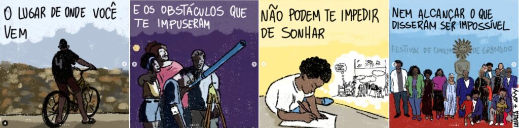 Descrição da imagem: No primeiro quadro a imagem de uma criança negra de costas, montado em uma bicicleta, no alto de um morro. Em sua camisa consta o número quatro. O texto do quadro diz: ” O lugar de onde você vem”. No segundo quadro, a imagem de uma família de pessoas negras (mãe, Pai, filha adolescente e filho criança) observam o céu da noite com o auxílio de um telescópio. A imagem contém o seguinte texto: “E os obstáculos que te impuseram”. No terceiro quadro, a imagem de uma criança negra imaginando uma uma cena de filme sendo dirigida, enquanto anota em um papel branco com um lápis. A imagem contém o texto: ” Não podem te impedir de sonhar”. No quarto quadro a imagem de diferentes pessoas, em mairoria negras – idosas, adultas, jovens e crianças, em cima de um tapete vermelho. Ao fundo o escrito “Festival de Cinema de Gramado”. A imagem contém o texto: ” Nem alcançar o que disseram ser impossível”. Ao final, Tirinha de 4 quadrinhos completos. No cabeçalho o título do projeto “Mandando a Real Letramento Empreendedor”. No rodapé as marcas dos realizadores e patrocinadores.